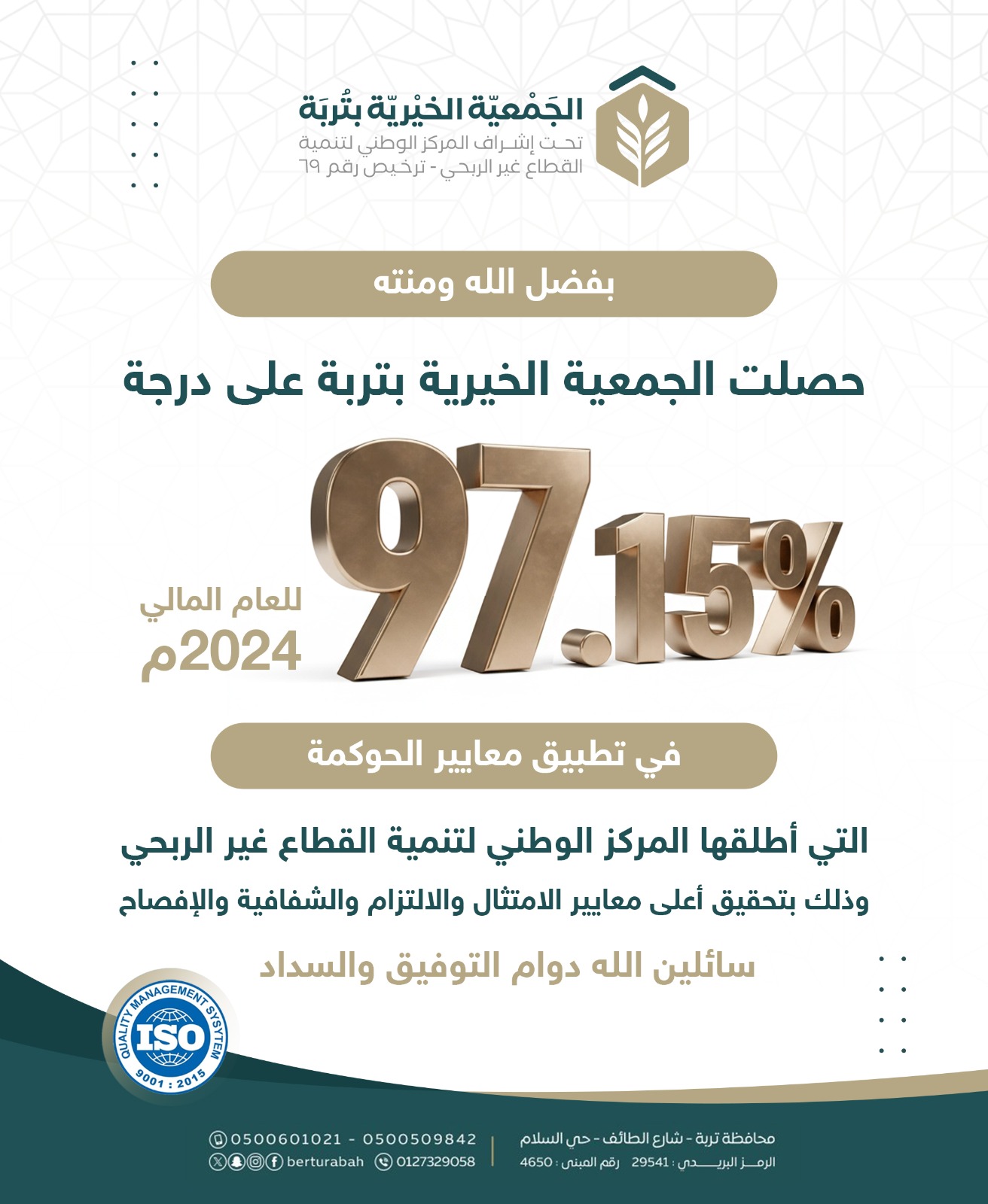 صدور درجة حوكمة 2024م الصادرة من المركز الوطني لتنمية القطاع غير الربحي للجمعية الخيرية بتربة